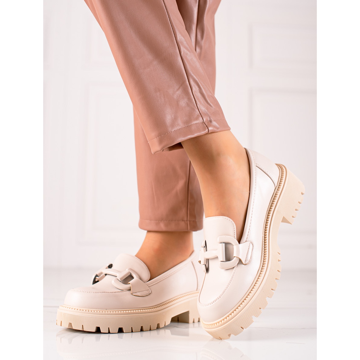 A mokaszinok 2,5 cm magas platformra és 4,5 cm magas lapos sarokra vannak felszerelve, ami növeli kényelmüket és egyben optikailag meghosszabbítja a lábakat. A futófelülettel ellátott műanyag talp szilárd tapadást biztosít különféle felületeken, így tökéletes a tavaszi és nyári napokon.