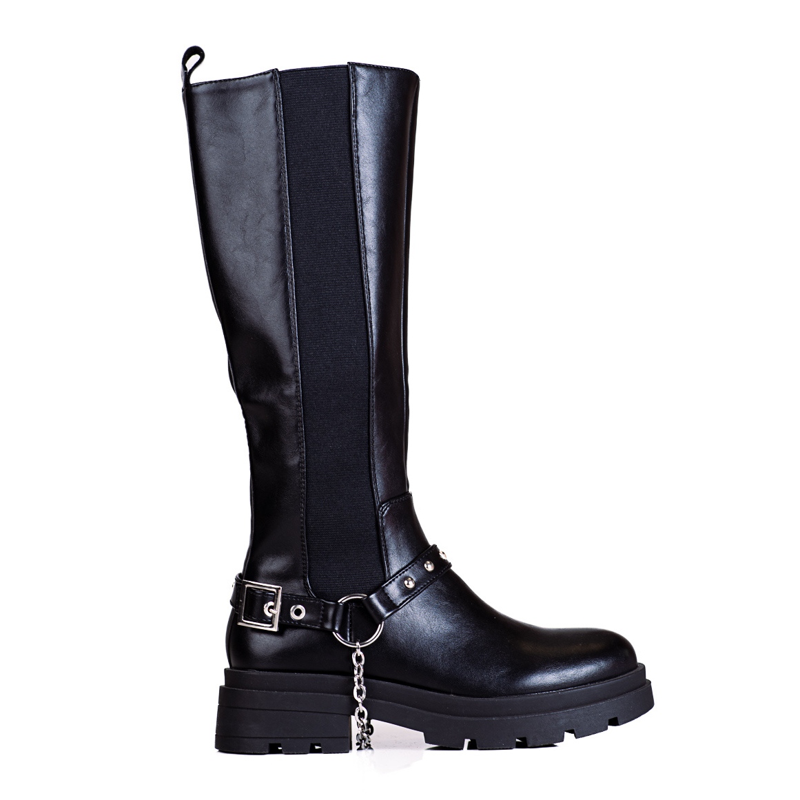 Az időtlen fekete színű, elegáns csizma kötelező minden nő ruhásszekrényében. Ökológiai bőrből készültek, és kombinálják a klasszikus vágást a modern részletekkel - egy dekoratív láncot és egy finom felső vonal, amely a térdre jut (a felső magassága: 34). A körkörös, teljes lábujjaknak köszönhetően a cipő még hosszabb viselettel is kényelmes.