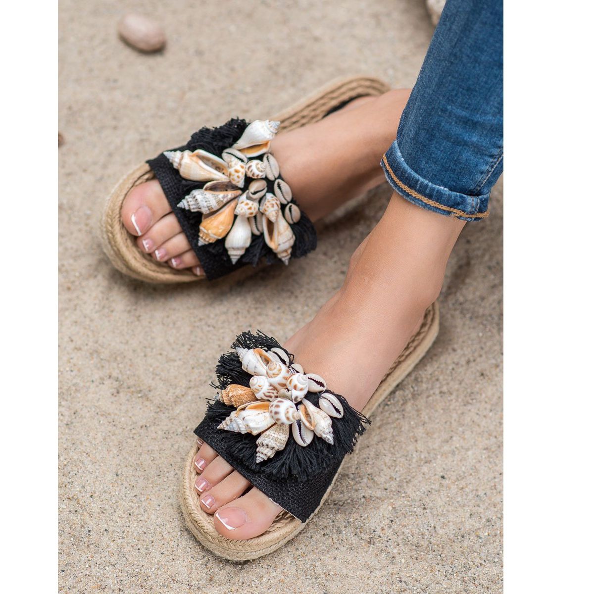 A divatos Seastar kagylós papucsok kötelező darabok a nyári napokon és estéken. Ezek az egyedi fekete papucsok az eleganciát és a laza, lezser stílust ötvözik, tökéletesen passzolva az ünnepi hangulathoz. A szemet gyönyörködtető kagylóknak köszönhetően a papucsok vonzzák a figyelmet, és karaktert adnak minden stílusnak.