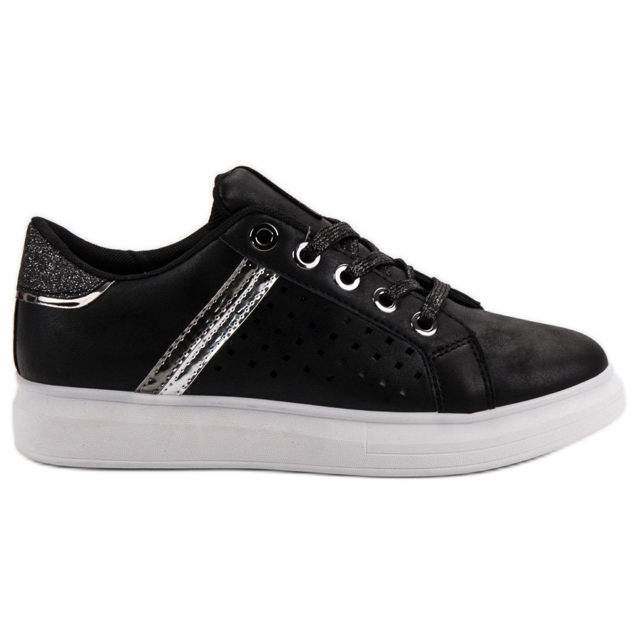Fedezze fel a divatos, elegáns fekete sportcipőt, amely ruhatára nélkülözhetetlen elemévé válik! Ezeket az egyedi cipőket fényes kiegészítőkkel gazdagították, amelyek modern karaktert adnak, és tökéletesen illeszkednek az aktuális trendekbe. A vastag talpnak köszönhetően, amely optikailag karcsúsítja az alakot, minden lépés könnyű és stílusos lesz.