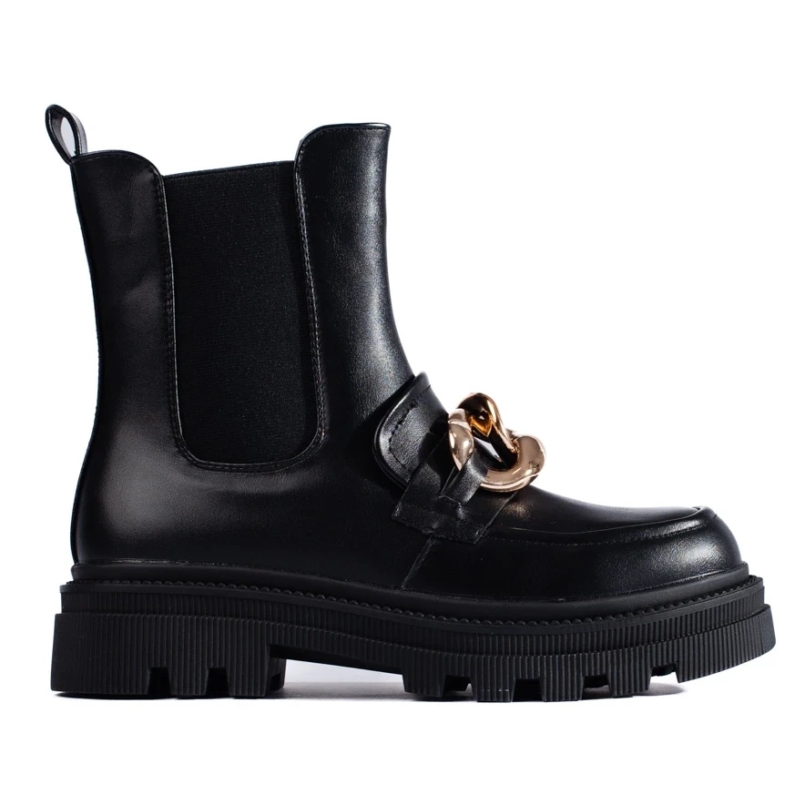 A platformon lévő fekete munkások praktikus és divatos csizmák, amelyek kényelmet nyújtanak a felmelegedésnek és a lágy rögzítésnek köszönhetően. Az ökológiai bőr az elegáns megjelenést mutatja, könnyű gondozással, és a futófelülettel rendelkező talp garantálja a jó tapadást a városi körülmények között. Az arany lánc hozzáadja a karaktert, és hangsúlyozza a lábbeli divatos természetét. Az oldalsó cipzáras rögzítőelem megkönnyíti a felhelyezést és a felszállást.