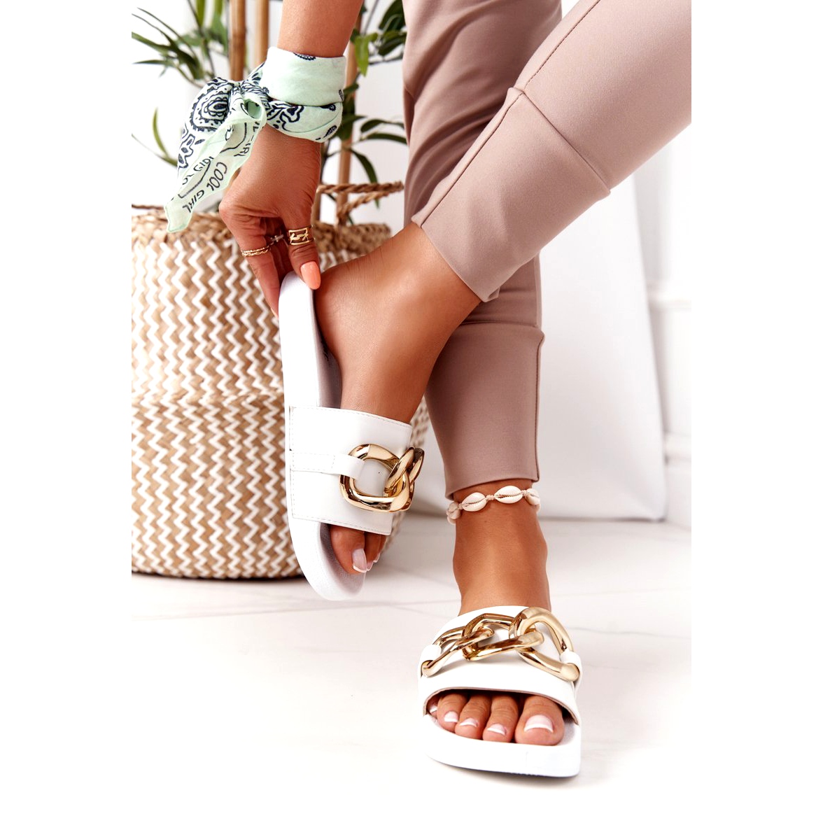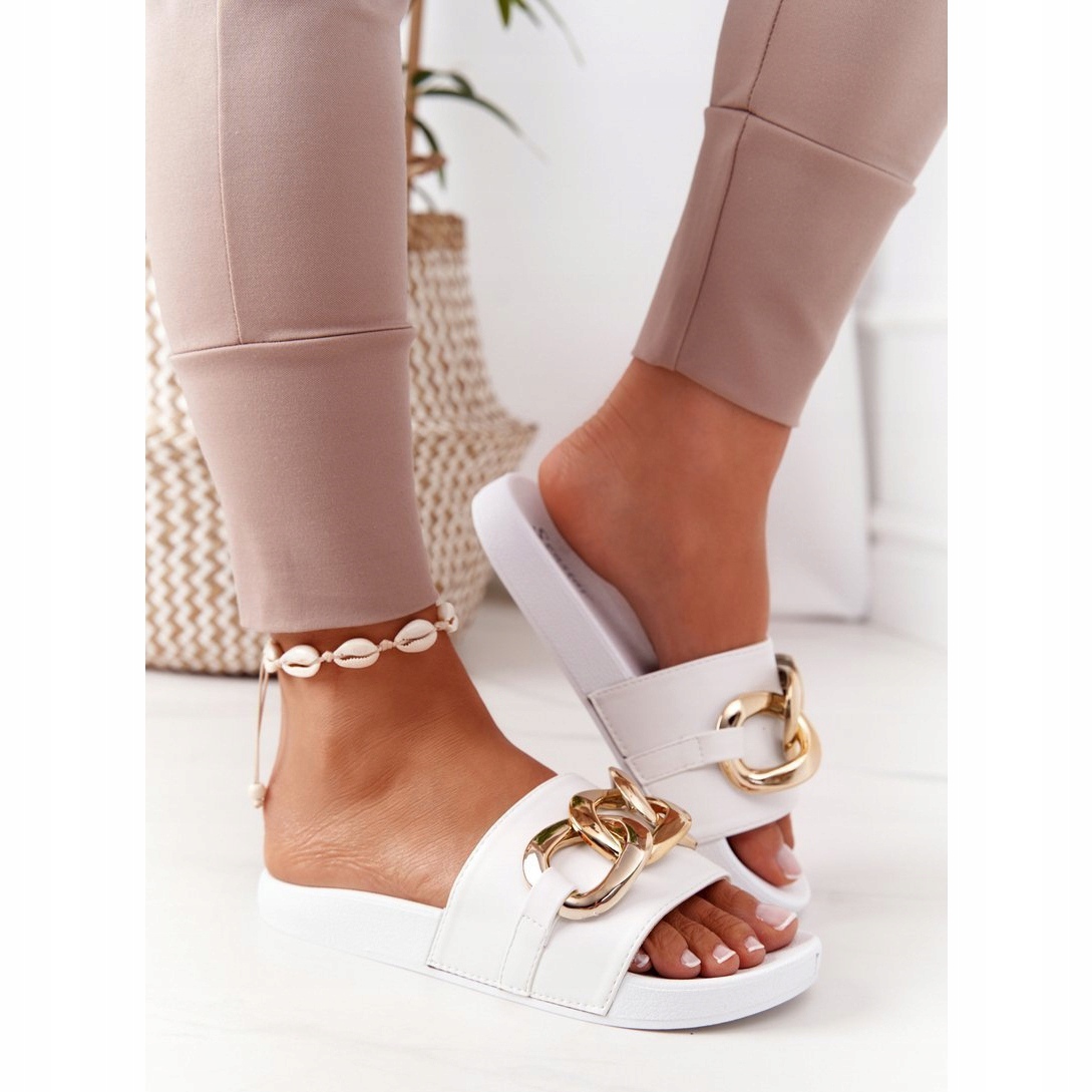 A papucsokat a modern nők számára tervezték, akik értékelik a minimalizmust és a divatos akcentusokat. A dekoratív lánc karaktert ad, és tökéletes kiegészítője a nyári stílusoknak. Ezenkívül könnyű felépítésük és 2,5 cm magas talpuk minden lépésnél kényelmet garantál.