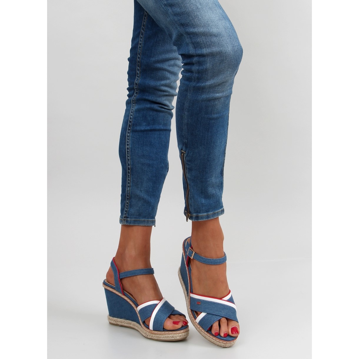 A szandálok egyedi akcentusa a piros díszítésű fehér pánt, amely karaktert ad, és nem csak praktikus, hanem stílusos kiegészítője is számos nyári ruhadarabnak. A 10 cm-es magas éknek köszönhetően ezek az espadrillek tökéletesen karcsúsítják az alakot, ugyanakkor stabilitást és kényelmet biztosítanak a viselet során.
