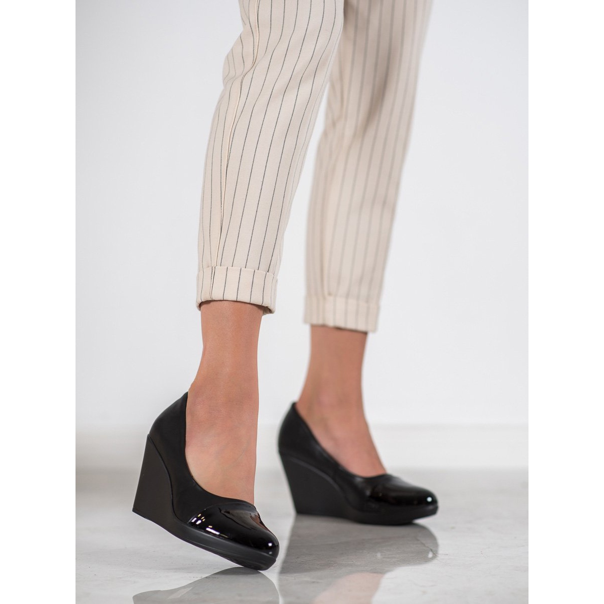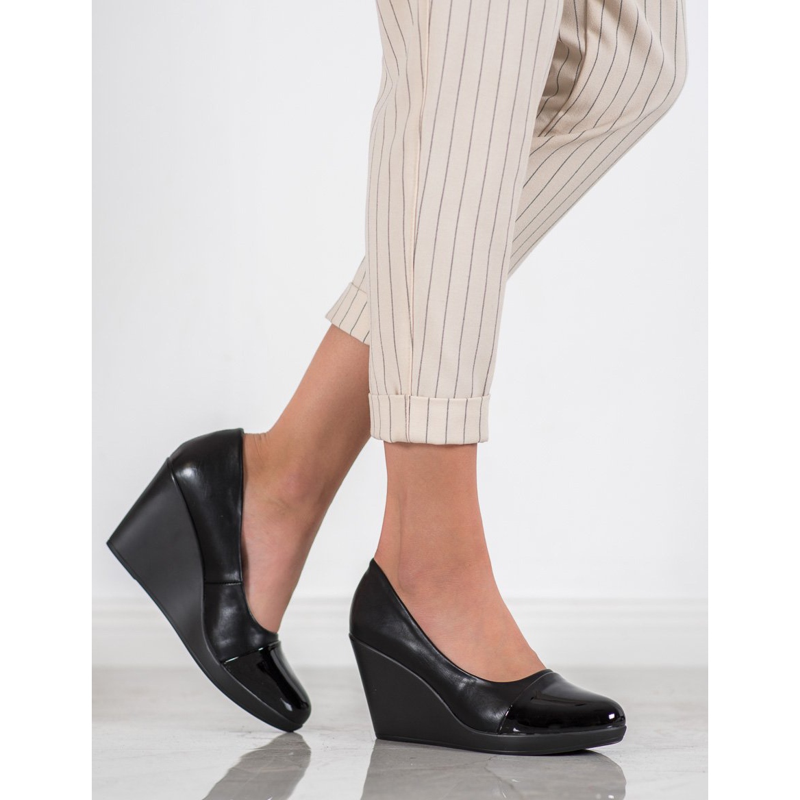 A pumpák kerek orrúak, ami klasszikus megjelenést kölcsönöz nekik, a felcsúsztatható rögzítési rendszer pedig gyors és kényelmes felhelyezést tesz lehetővé. A 8,5 cm-es ékmagasságnak köszönhetően mindennapi használatra és különleges alkalmakra is alkalmasak, mint például ünnepségek vagy esti partik.