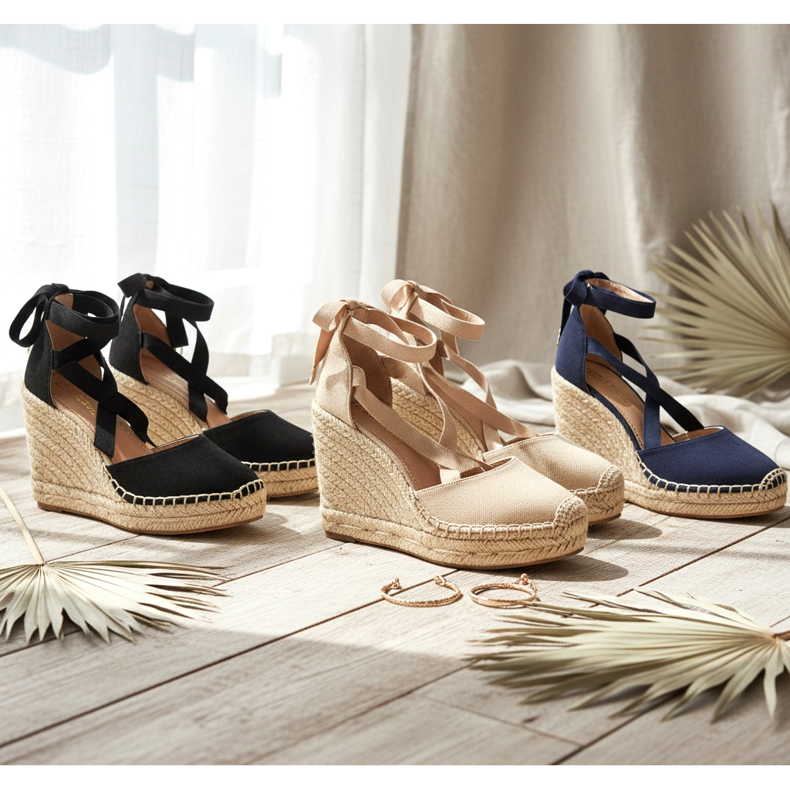 A leguniverzálisabb modellek bézs, fekete vagy sötétkék. Ha optikailag szeretné meghosszabbítani a lábát, válasszon bézs színű espadrillákat, amelyek illeszkednek a bőrszínéhez (vagy barnaságához). Ne feledje, hogy a boka körüli átkötés lerövidítheti a lábszárat, ezért az alacsony embereknek óvatosnak kell lenniük a túl széles szalagokkal.