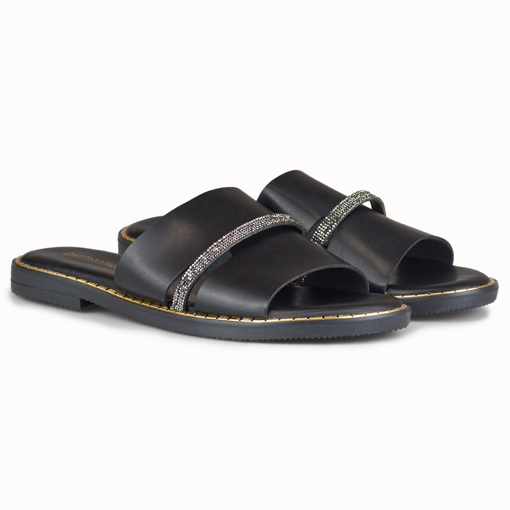 Az elegáns fekete papucs, amely a cirkonokkal praktikus és stílusos kiegészítést nyújt a nyári szekrényhez - a kényelem itt finom eleganciával találkozik.