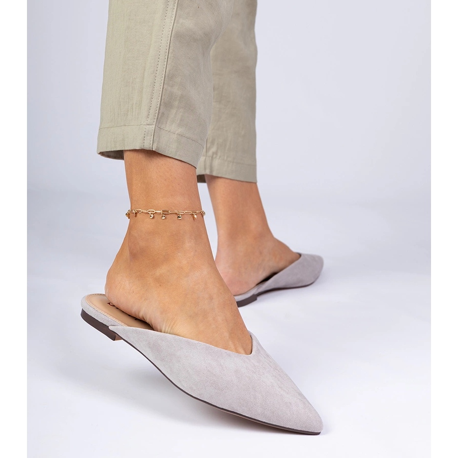Az 1 cm -es magasságú lapos sarok garantálja az egész nap viselésének kényelmét, és a Spitz -i orrú, elegáns vágás minden nemességet és egyedi karaktert ad. A szürke árnyék harmonikusan harmonizál egy bézs műanyag talppal, ami azt jelenti, hogy ezek a papucsok könnyen kombinálhatók mind az alkalmi, mind az elegánsabb ruhákkal.