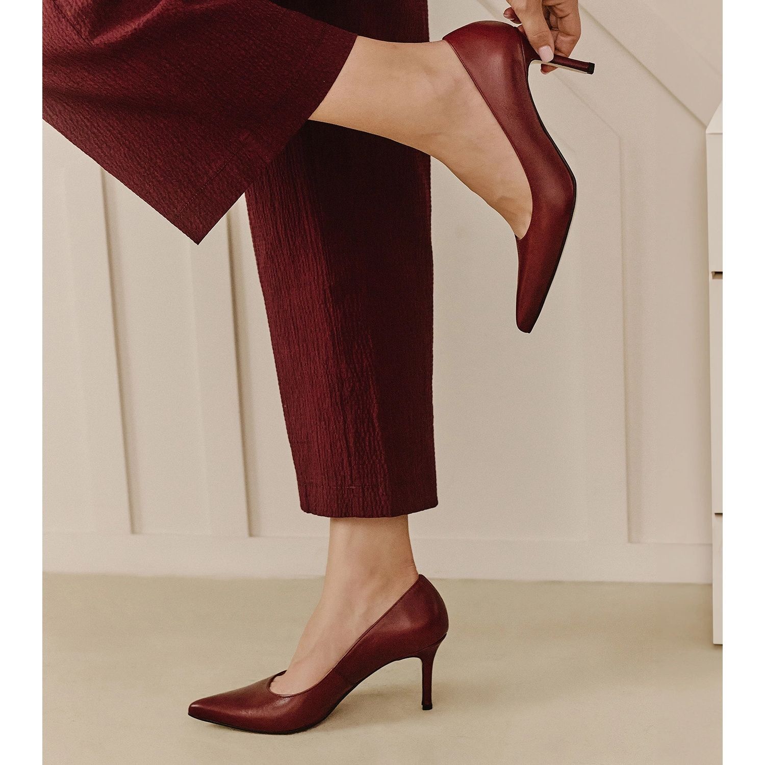 A hegyes orr és az elegáns, 7 cm -es magas csap megkülönböztetett karaktert ad ezeknek a cipőknek, amelyek tökéletesen illeszkednek a legújabb divat trendekhez. A természetes bőrrel készített szivattyúk belseje sétáláskor kényelmet nyújt, és a bőrrel bevont bőr elegáns akcentust ad a sarokhoz.