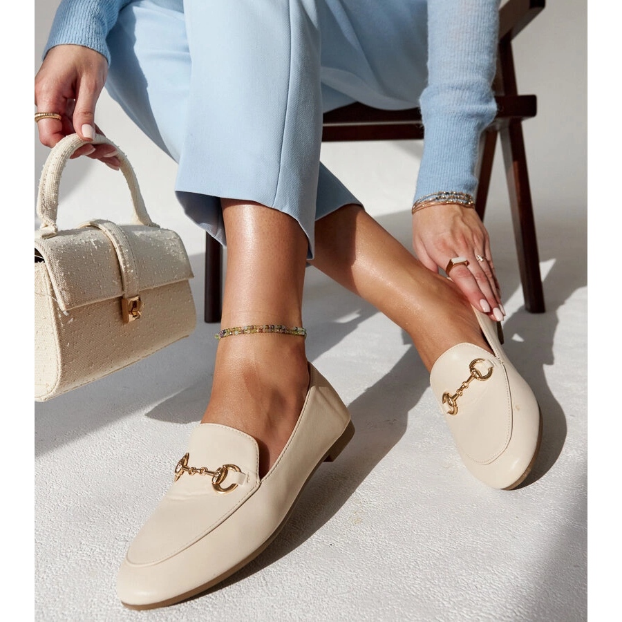 Ezeknek a cipőknek gyönyörű, bézs színű, amely tökéletesen megy a különféle stilizációkkal. További előnye a részletek olyan lánc formájában, amely egyedi karaktert ad nekik. A csak 1 cm -es sarok magassága egész nap nagyon kényelmessé teszi őket, és a barna műanyag talp garantálja a tartósságot és a stabilitást.