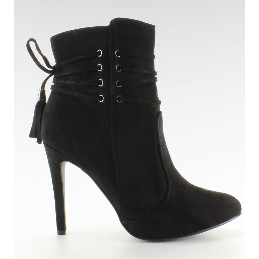 Magas sarkú bokacsizma 4074 Fekete - érzéki, elegáns és praktikus. Klasszikus fekete csizma ökológiai velúrból, finom szőrme szigeteléssel, tökéletes a hidegebb napokra. A 10 cm magas tűsarkú karcsúsítja az alakot, a finom zsinórok a boka körül rojtokkal pedig stílusos akcentust adnak. Belül cipzár található, ami megkönnyíti a gyors felhelyezést.