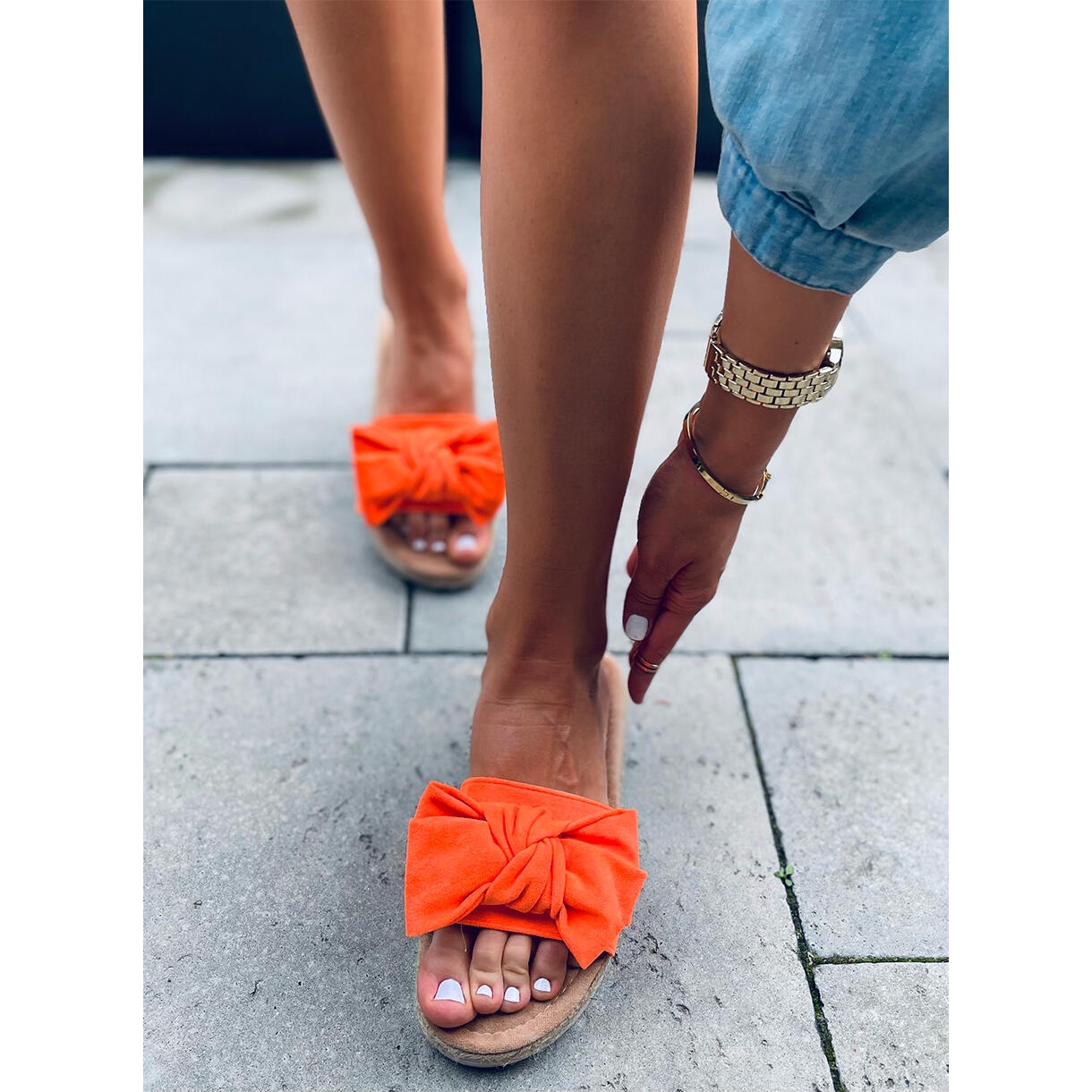 Fedezze fel a Viola Orange espadrille papucsok egyedi varázsát, amelyek mindennapi ruhatára új kedvenc elemévé válhatnak. Ezek a sugárzó narancssárga árnyalatú női velúr papucsok egyszerűségükkel és eleganciájukkal gyönyörködnek. Az elülső gyönyörű masni bájt varázsol, és kiemeli őket a többi modell közül.