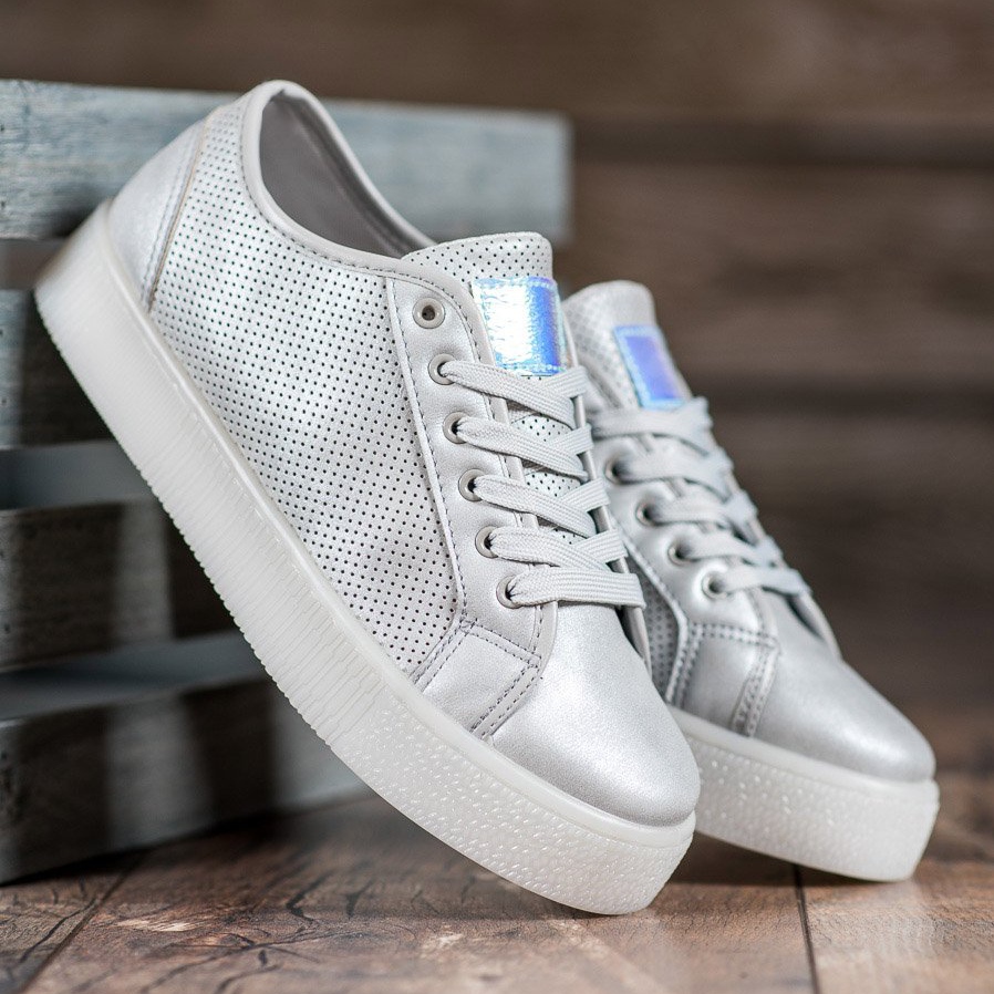 Az áttört mintájú ezüst tornacipő tökéletes választás pasztell ruhákhoz és farmerekhez, rendhagyó és stílusos stílusokat teremtve. A futófelülettel ellátott szintetikus talpnak és a puha saroknak köszönhetően maximális kényelmet biztosítanak egész nap. A kerek orr és a fűzős rögzítés sportos karaktert kölcsönöz nekik, a 2 centiméteres platform pedig nemcsak kényelmessé, hanem divatossá is teszi őket.