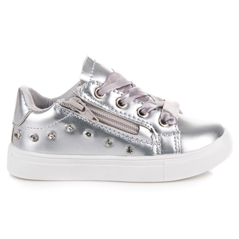 Stílusos cipők lányoknak, amelyek a divatos megjelenést a mindennapi kényelemmel kombinálják. Ökológiai bőrből készült felsőrész ezüst, enyhén csillogó árnyalatban kívül kristályokkal díszített, a hagyományos csipkék helyett vonzó szalag pedig lányos varázst ad. A modell praktikus cipzárral is fel van szerelve, amely megkönnyíti a cipők fel- és levételét.