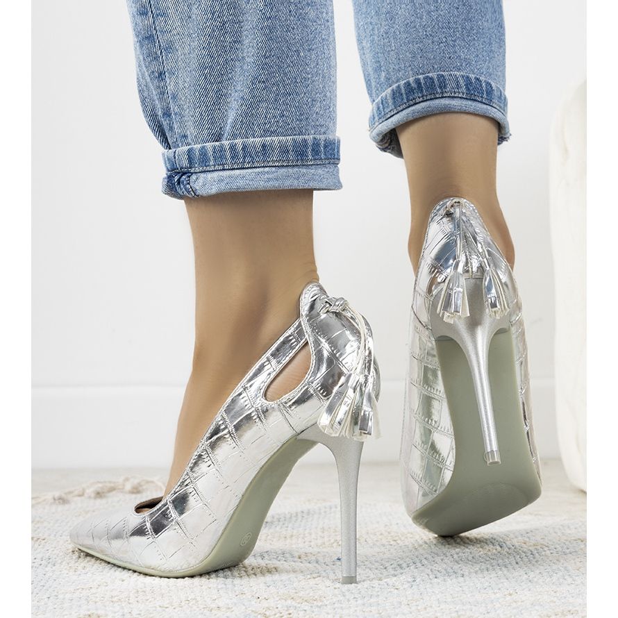 Ezüst magassarkú dekoratív kivágásokkal A Permewan tökéletes választás azoknak a nőknek, akik esti kirándulásokon szeretnék hangsúlyozni eleganciájukat és stílusukat. Ezek az egyedi, ökológiai bőrből készült pumpák divatos, krokodilbőrre emlékeztető szerkezettel ötvözik a modern dizájnt a klasszikus stílussal.