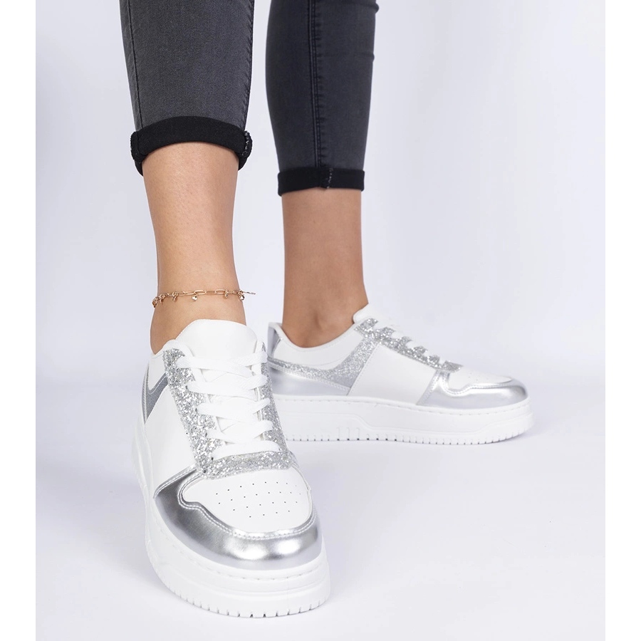 A vastag talp használata, amelynek magassága 4,5 cm, nem csak néhány centiméter magas szintet ad, hanem kényelmet is biztosít a mindennapi kopás során. A fehér, gumi talp jól ellentétben áll egy fényes ezüst felsõvel, ami ezeket a cipõket minden stílus valódi dekorációjává teszi. A kerek orr és a kötött kapocs garantálja a praktikusságot és a könnyű felhelyezést.