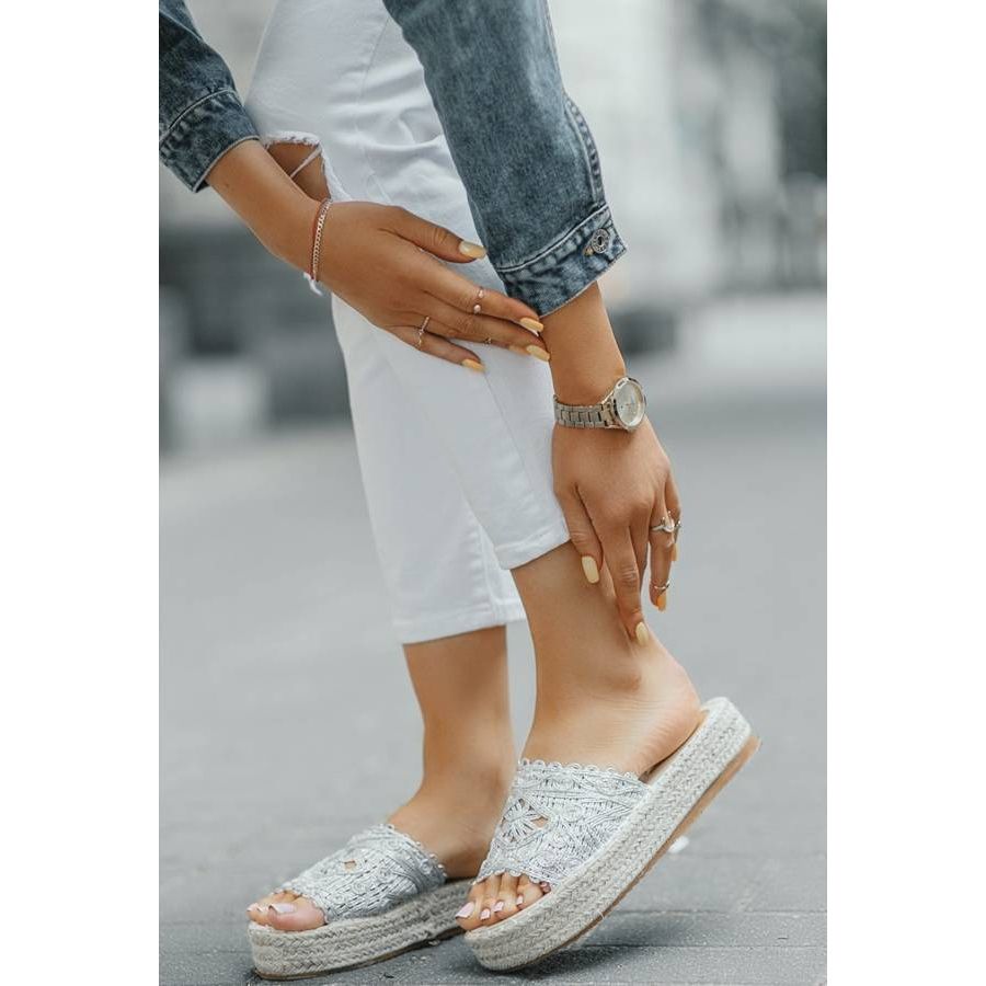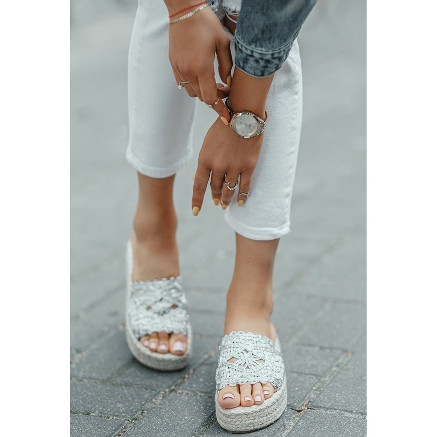 Fedezze fel az egyedülálló Sudden Draft platformú papucsokat, amelyek kombinálják a kényelmet és a divatos dizájnt! Ezeket a gyönyörű ezüst papucsokat a kifinomult fonott zsinór díszíti, amely egyedi karaktert ad nekik. A Sudden Draft modell öve egyszerre finom és fenomenális – tökéletes azoknak a nőknek, akik értékelik az eleganciát a mindennapi megjelenésben.