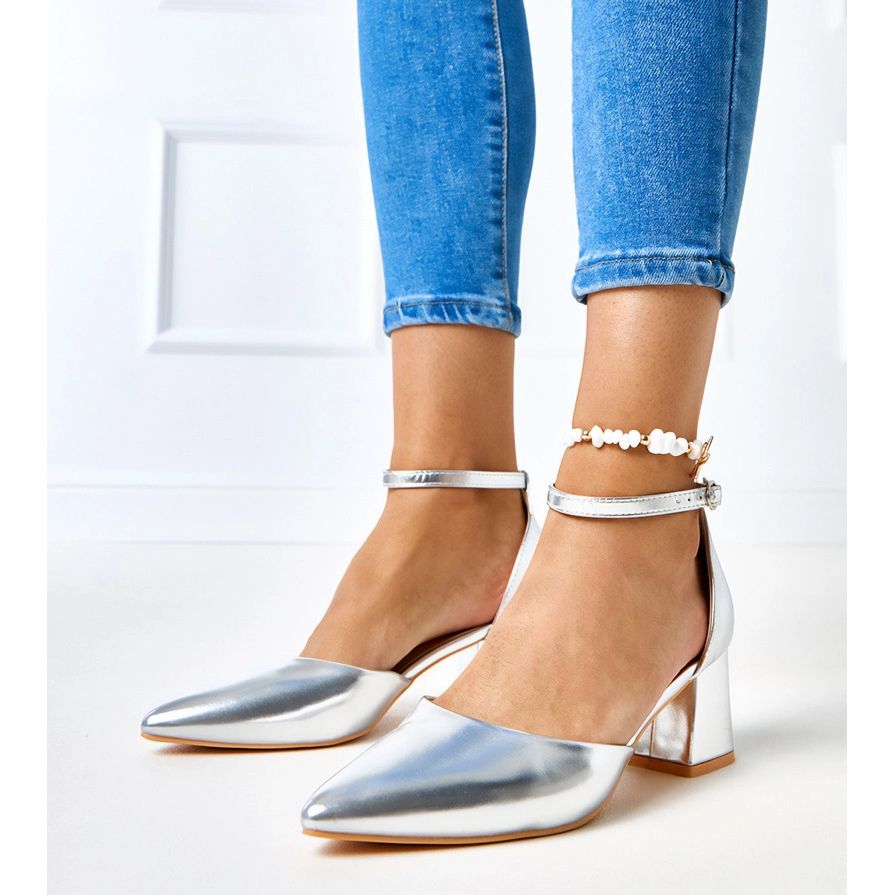 Az ezüst szín minden stilizálás pompáját adja, és a hegyes orr nagyon nőies karaktert ad nekik. A 6 cm -es sarokmagasságnak köszönhetően a szivattyúk tökéletesek mind az elegáns, mind a napi kombinációkhoz. A boka körüli csat rögzítése biztosítja a stabilitást és hangsúlyozza a lábakat, és a barna műanyag talp elegáns és praktikus.