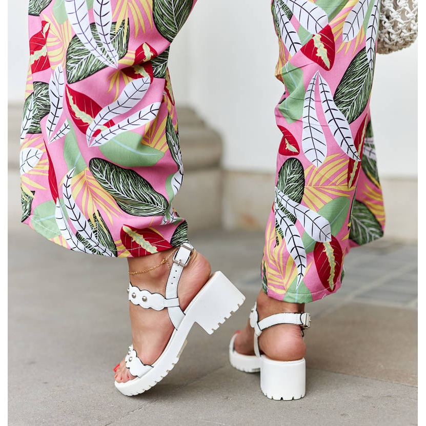 A kiváló minőségű ökológiai bőrből készült szandál egész napos viselési kényelmet biztosít. A fehér szín univerzális karaktert ad nekik, a dekoratív strasszok pedig finom csillogást adnak. Kényelmes 5 cm-es saroknak köszönhetően tökéletesen kiegészítik a hétköznapi és az elegánsabb ruhákat is.