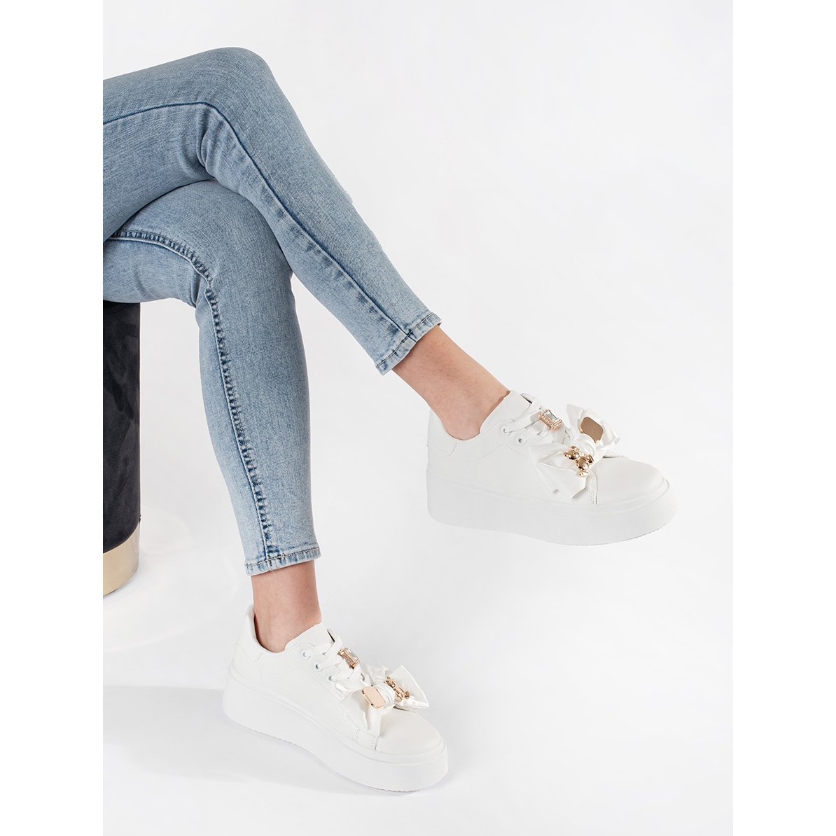 A modell stabilitását egy 5 cm magasságú műanyag talp biztosítja, és egy 4 cm -es magas platform finom stílust ad, amely megfelel a különféle stílusoknak. Az arany díszítés a klasszikus fehér cipőkkel kombinálva luxus karaktert ad nekik, ami arra készteti őket, hogy naponta és elegánsabb alkalmakban is működjenek.