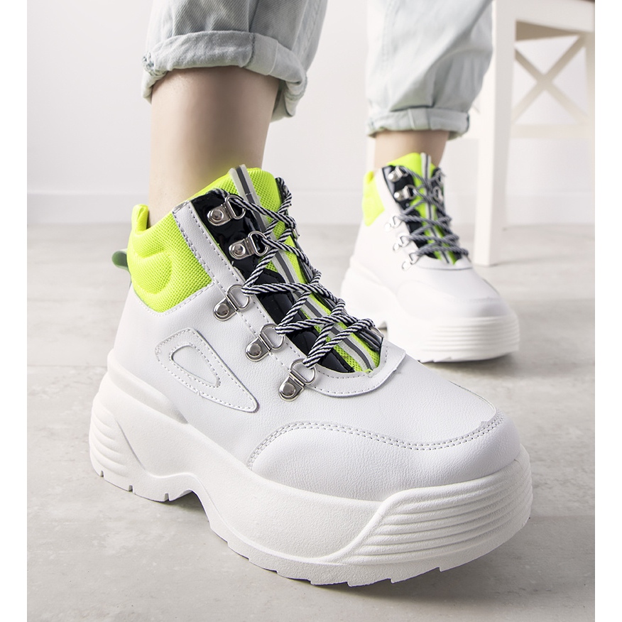 Az Eloquence magas talpú tornacipő tökéletes választás a hidegebb napokra, a kényelmet és a divatos dizájnt ötvözi. A kiváló minőségű ökológiai bőrből készült fehér cipőket stílusos, szokatlan neonzöld színű betétek különböztetik meg, amelyek tökéletesen kiemelik a bokát.