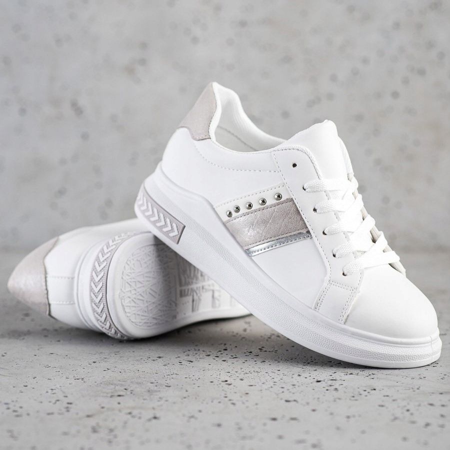 A 4 cm magas platformmal a fehér SHELOVET tornacipők egy kis magasságot adnak a kényelem feláldozása nélkül. A felsőrészen elhelyezett strasszok egyedi karaktert adnak a cipőknek, és kiemelik a tömegből.