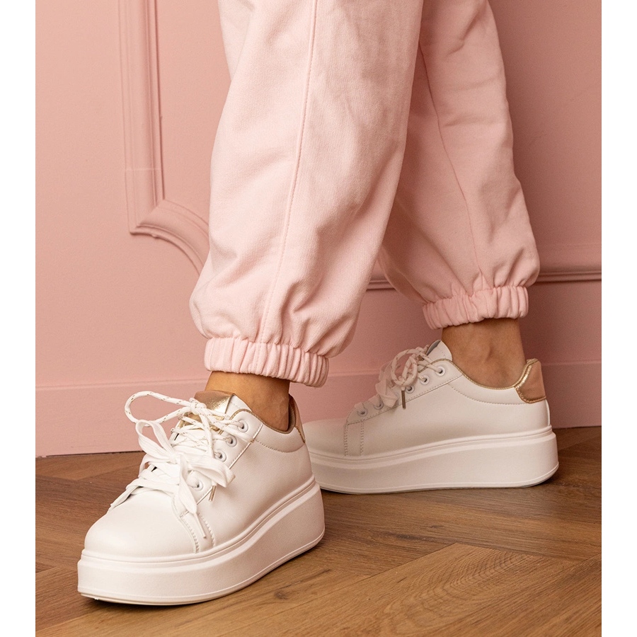 Fedezze fel az eleganciát és a kényelmet a fehér és arany sportos cipőkkel a RA2140 modell platformon, amely tökéletesen illeszkedik a legújabb divat trendekhez. Ezek az egyedi cipők egyesítik a modern dizájnt és a gondos kivitelezést, amely még a legigényesebb nőket is kielégíti.