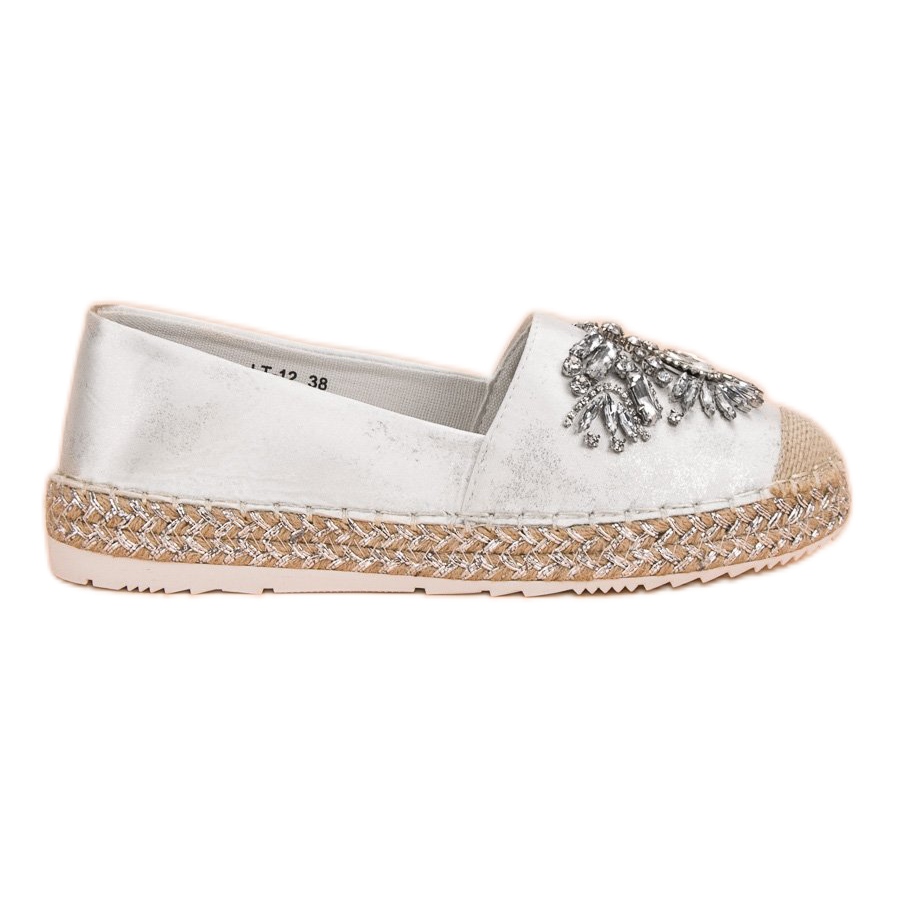 Ezeket a fehér espadrillákat kerek orr és puha, beépített sarok jellemzi, amely kényelmes illeszkedést biztosít a lábfejhez. A futófelülettel ellátott szintetikus talp megfelelő tapadást garantál, a 3 cm-es platformmagasság pedig finom emelést ad a lábak megterhelése nélkül. Ezenkívül a strasszok és az ezüst díszítések felkeltik a figyelmet, divatos karaktert adva az egésznek.