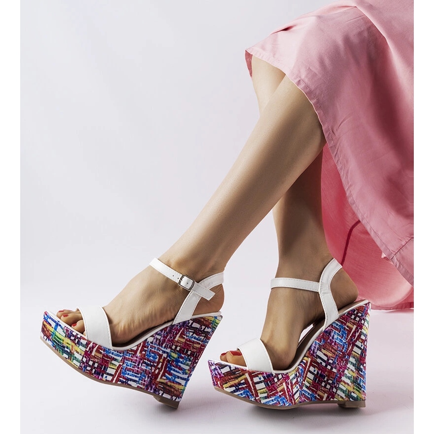 Elegáns, nyári szandál egy stabil ékön, amelyek kombinálják a klasszikus formát dekoratív akcentussal. Tökéletes a mindennapi stilizációkhoz és az elegánsabb alkalmakhoz - Fehér, multi -colored dekorációval frissséget és karaktert ad.