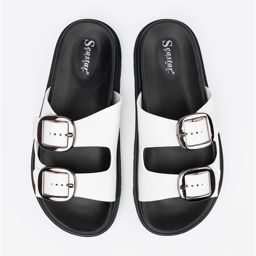 Fedezze fel az eleganciát és az egyszerűséget a Seastar egyik legújabb modelljében! Az ezüst csatokkal ellátott fehér papucsok nagyszerű választás minden olyan nő számára, aki minden nap értékeli a kényelmet és a stílust. A lapos saroknak köszönhetően rendkívül kényelmesek, és ideálisak mind a nyüzsgésben, mind a tengerparton töltött pihentető napok során.