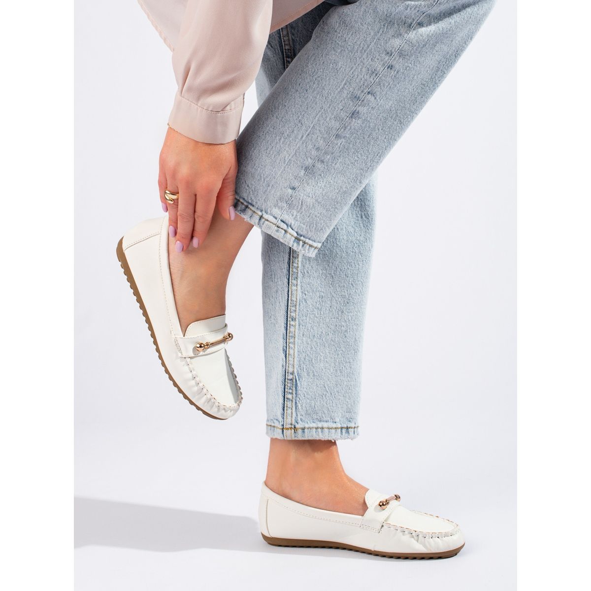 A finom arany árnyalatú strasszokkal díszített fehér mokaszinok elegáns akcentust kölcsönöznek, amely magával ragadja a tekintetet. Tökéletesen passzolnak a legkülönfélébb stílusokhoz, az alkalmitól az elbűvölőig. Az ökológiai bőrből készült bőrbetétnek köszönhetően lábai egész nap kényelmet élveznek.