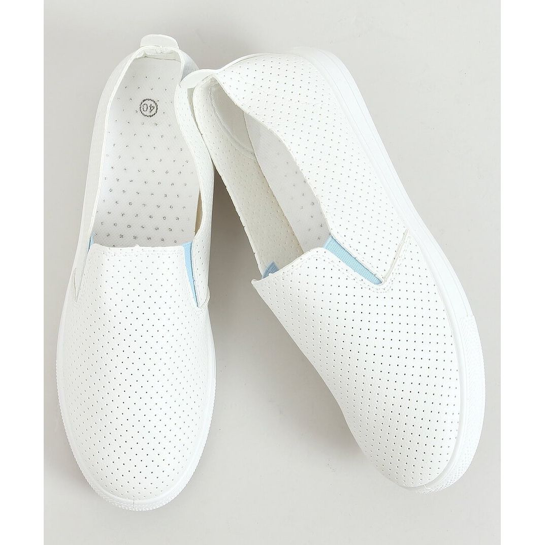 Bemutatjuk a fehér LA45 Blue bebújós tornacipőt kék díszítéssel - tökéletes kiegészítője tavaszi ruhatárának! Ezeket a stílusos női tornacipőket modern dizájn jellemzi, és tökéletesen kiegészítik az alkalmi stílusokat. Finom, áttört textúrájú ökológiai bőrből készültek, nem csak a divatos megjelenést, hanem a viselési kényelmet is garantálják.