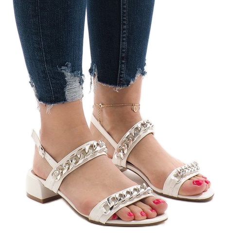 Fedezze fel az eleganciát és a kényelmet a fehér 77-15 magas sarkú szandálokkal, amelyek tökéletes választás a modern nők számára. A csattal záródó egyedi szandálok tökéletesen ötvözik a klasszikus stílust a modern díszítéssel. A két helyen összefonódó dekoratív lánc egyedi karaktert kölcsönöz a cipőknek, amely felkelti a figyelmet és kiemeli a stílust.