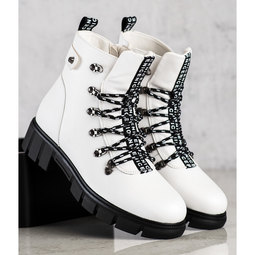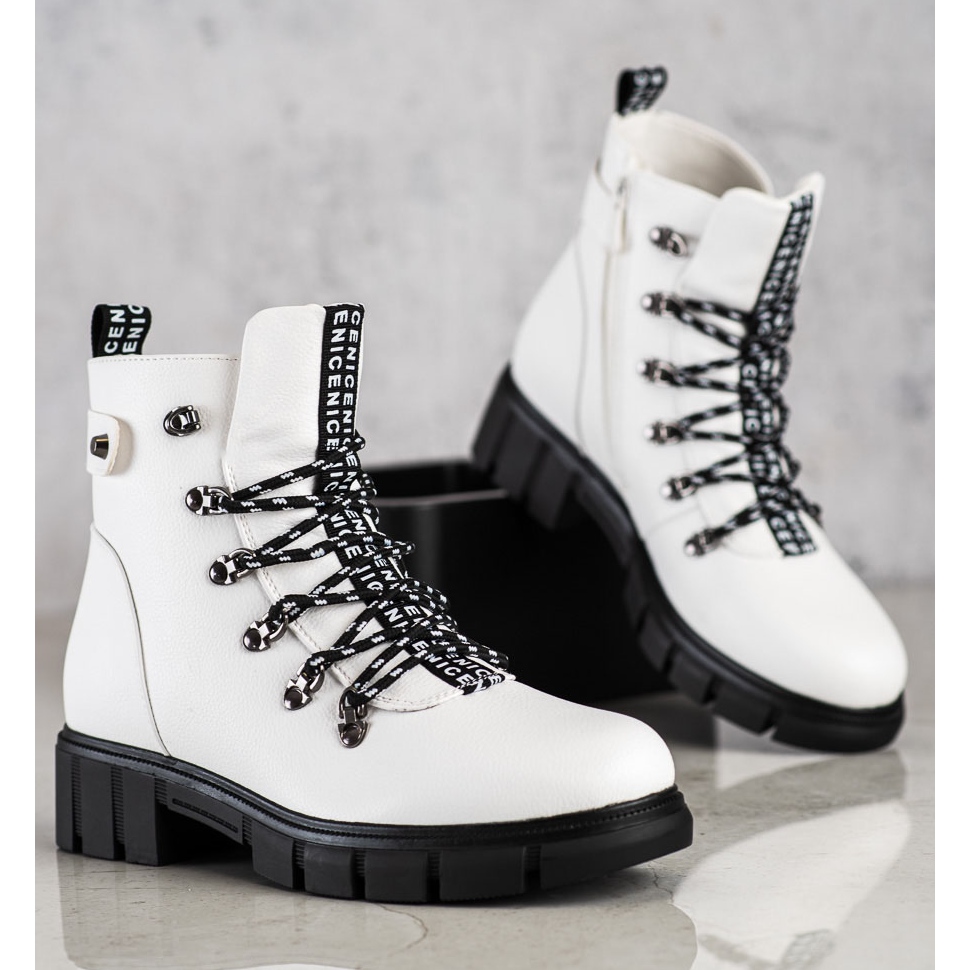 A fehér VINCEZA platformmunkások tökéletes választás minden divatos nő számára, aki értékeli a kényelmet és a stílust. Az összes szükséges funkcióval ellátva megfelelnek a modern nők igényeinek, akik nem félnek játszani a divattal, miközben a kényelemre összpontosítanak. Adja hozzá őket kollekciójához, és élvezze a divatos megjelenést egész ősszel és télen!