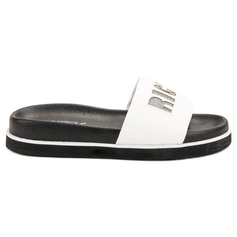 Készüljön fel a közelgő nyárra a Vinceza masszív papucsokkal, amelyek az ünnepi ruhatár elválaszthatatlan elemei lesznek. Minimalista, fehér színük tökéletesen kombinálható a különböző stílusokkal, a "RICH" felirat pedig karaktert és eredetiséget ad.