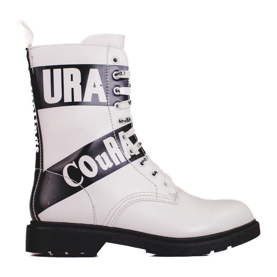 A kiváló minőségű ökológiai bőrből készült munkások rendkívül elegánsan néznek ki, fehér színük pedig frissességet ad minden stílusnak. A kerek orr és a 24 cm-es felső szélesség nemcsak divatossá, hanem praktikussá is teszi a cipőt. További előnye a textil talpbetét, amely garantálja a láb kényelmét és szellőzését.