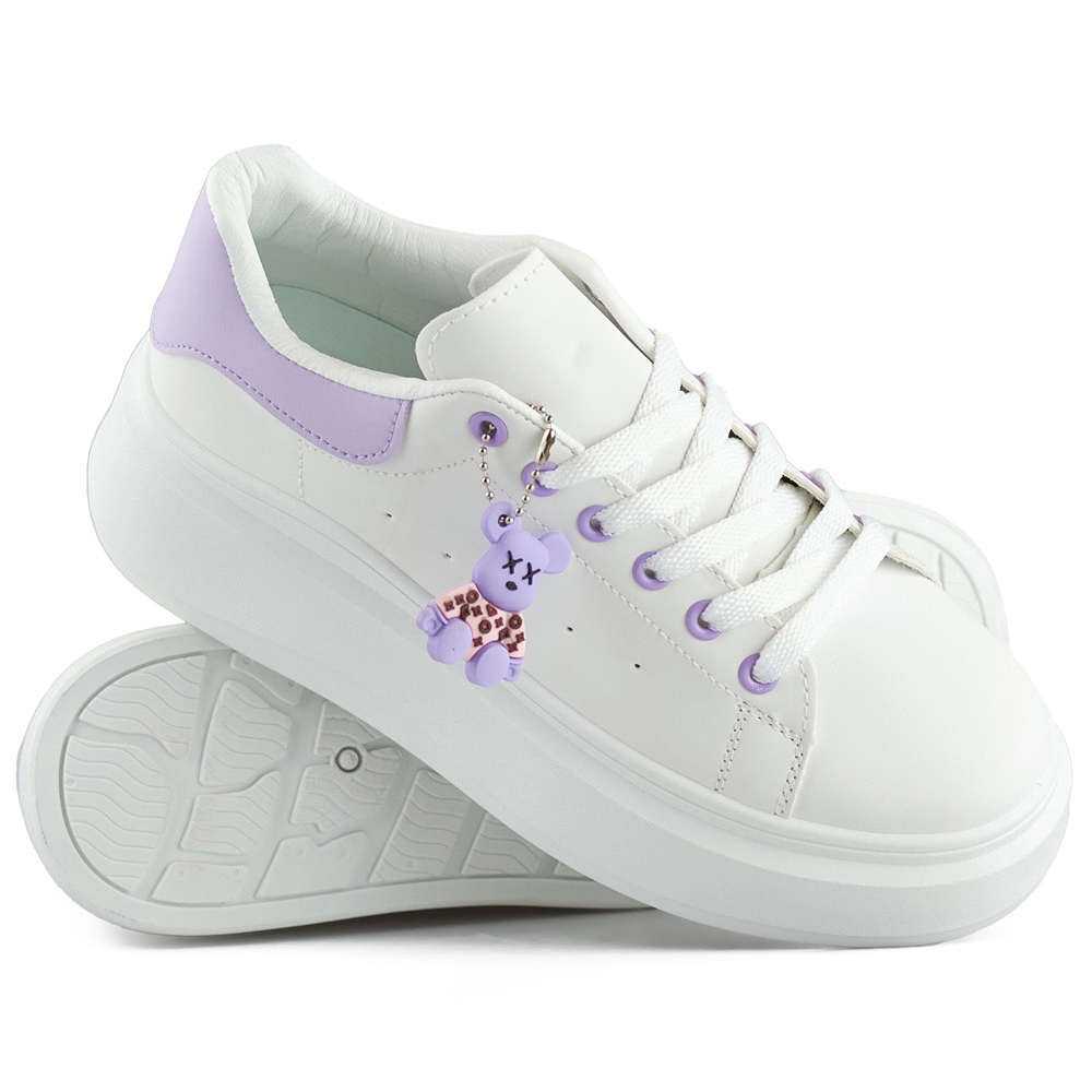 A fehér sportcipő vastag talpon, lila mackóval, kiváló választás azoknak a divatos nőknek, akik nem akarnak feladni a kényelmet. Fektessen be velük ma, és érezze a különbséget! A gyártó eredeti csomagolása egyedi karaktert ad nekik, és mindegyik elemet gondosan átgondolták, hogy megfeleljenek a legigényesebb felhasználók elvárásainak.