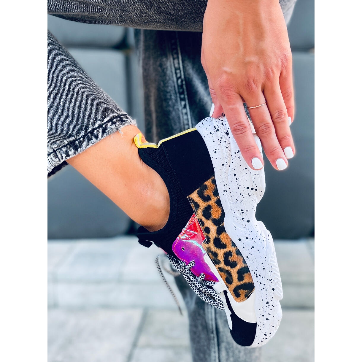A figyelemfelkeltő részletek a holografikus betétek és a merész leopárd motívum, amelyek egyedi karaktert adnak a cipőnek. Tökéletesek mindennapi használatra, városi stílusban és sporttevékenységek során egyaránt jól működnek. 4 cm-es lapos sarkuk egész napos viselési kényelmet biztosít, a kerek orr pedig könnyedséget ad.