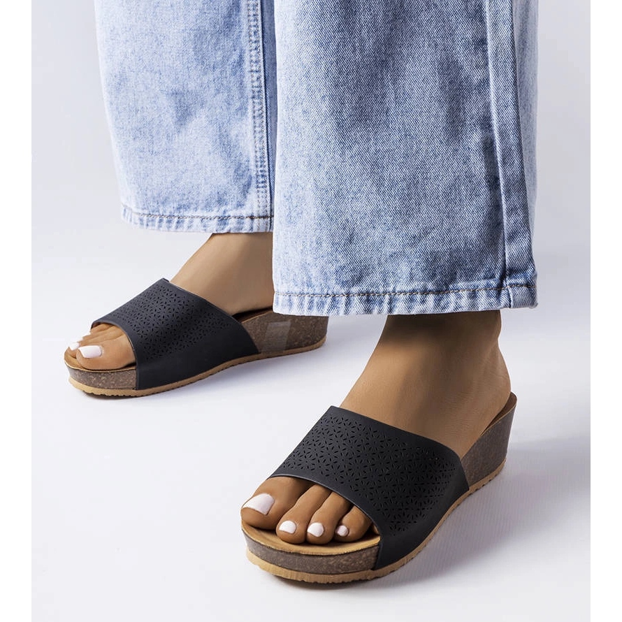 A Bourque fekete áttört ékszandál tökéletes választás azoknak a nőknek, akik szeretnék ötvözni a divatot a kényelemmel. Ezeket a stílusos papucsokat a finom perforációval ellátott széles pánt jellemzi, amely nemcsak eleganciát ad, hanem megfelelő szellőzést is biztosít a lábaknak. A teljes egészében kiváló minőségű ökobőrből készült papucsok nemcsak esztétikusak, hanem tartósak és könnyen karbantarthatók is.