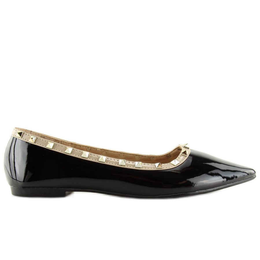Fekete szegecses balettlapos 127-16 Fekete egyedi női cipők, amelyek ötvözik az eleganciát a modern stílussal. Az ökológiai lakkbőrből készült balettlakások nem csak karcsú formájukkal vonzzák magukra a figyelmet, hanem szemet gyönyörködtető részletekkel is, amelyek karaktert kölcsönöznek a szegecseknek.