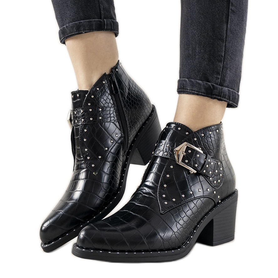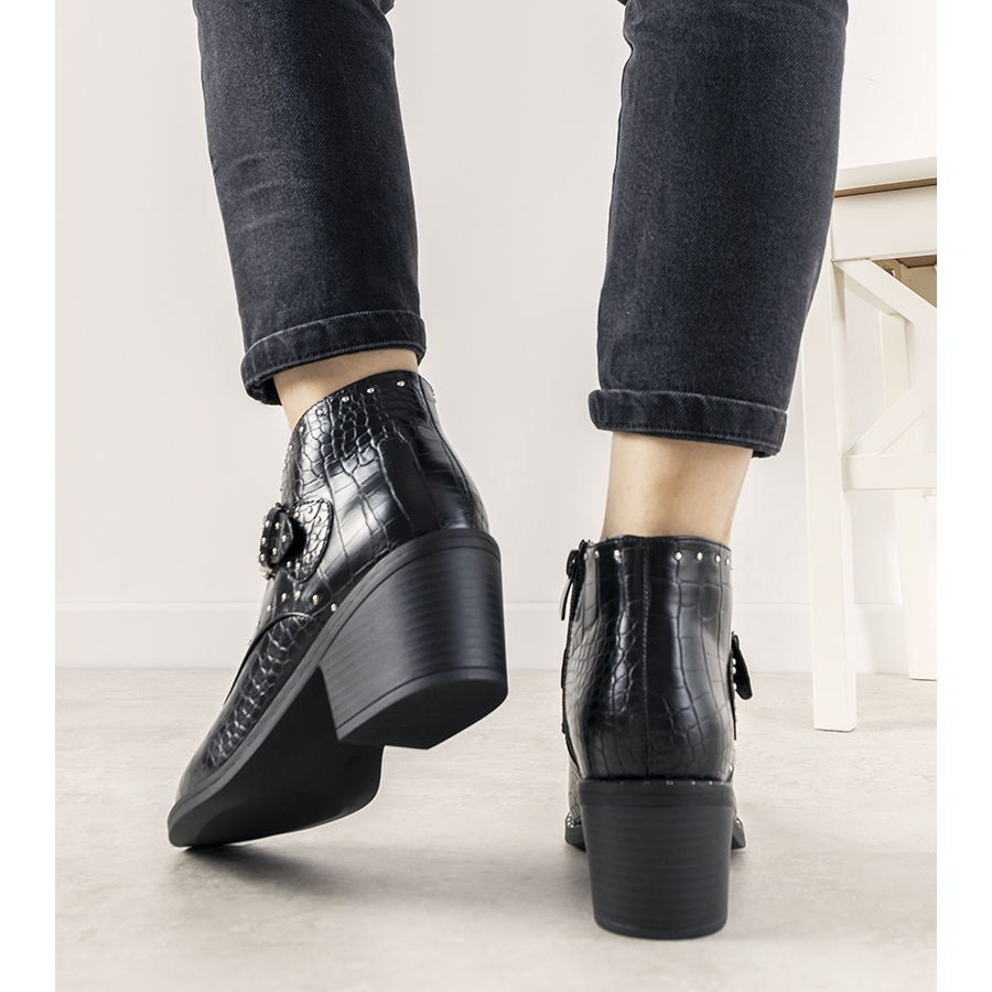 A Montiana csattal ellátott fekete magas sarkú bokacsizma tökéletes választás azoknak a nőknek, akik a stílust a kényelemmel szeretnék ötvözni. A krokodilbőr által ihletett Montiana modell egyedi megjelenése minden bizonnyal mindenki figyelmét felkelti. Nemcsak elegáns megjelenést, hanem funkcionalitást is biztosítanak a cipzárnak köszönhetően, amely lehetővé teszi a cipő egyszerű fel- és levételét.