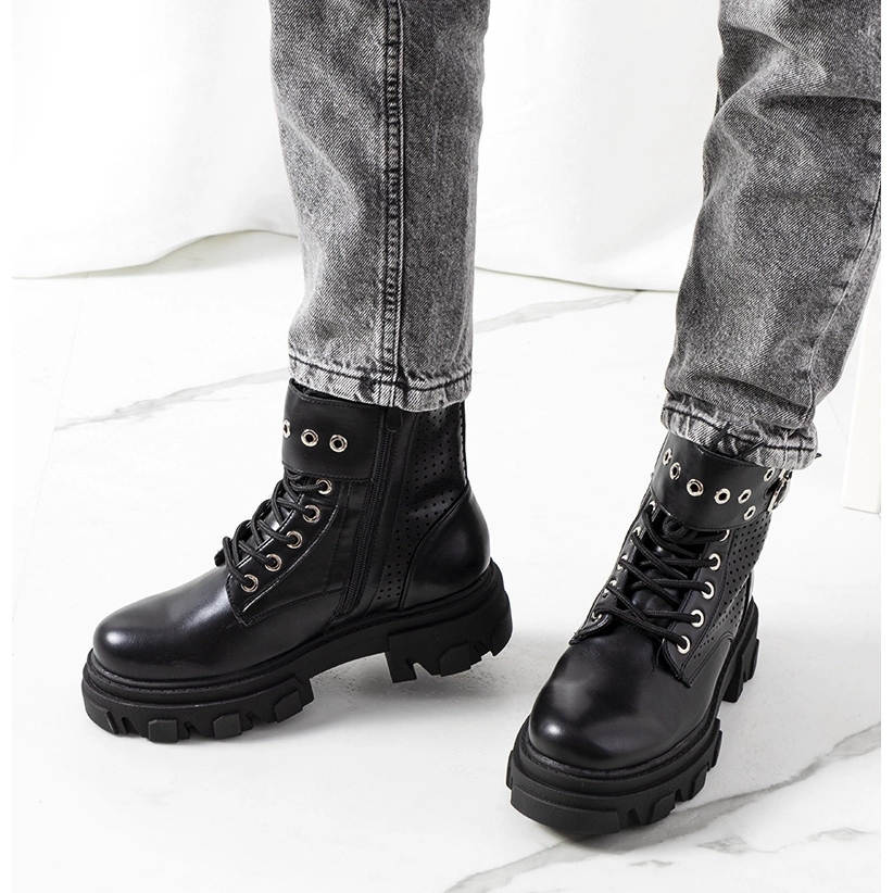 Fekete Rubeo csizma egy csapda talpon - tökéletes, ha karom stílusát szeretne hozzáadni. A szilárd, traktor talp nyers karaktert ad nekik, a szabadmunka és a fúvókák pedig rock stílusát adják. Az ökológiai bőrből készült felső, kiváló minőségű, esztétikai megjelenést és tartósságot biztosít, míg az ökológiai bőr beszúrása szintén garantálja a kényelmet.