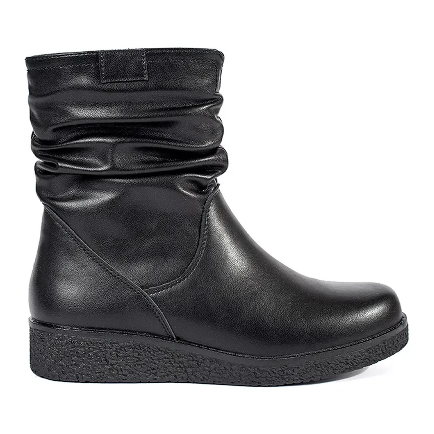 Kiváló minőségű, természetes bőrből készült csizmákat egy fejlett vágással megkülönböztetnek, ráncos felsőkkel, amely finom nőiességet ad nekik. A sima műanyag talp kényelmet nyújt, és a sarok magassága 3,5 cm -re stabil és kényelmessé teszi őket egy hosszú nap alatt.