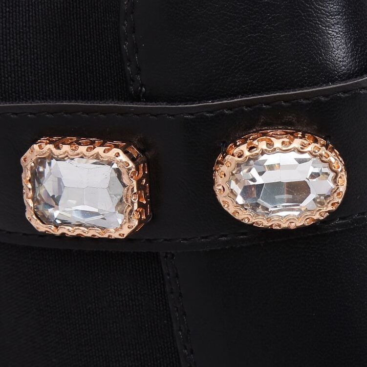 Ezt a modellt az arany keretben elhelyezett lenyűgöző strasszok jellemzik, amelyek egyedi karaktert kölcsönöznek neki, és bármilyen stílust ragyogóvá varázsolnak. Az oldalán elasztikus betét és a cipzáros zárás praktikus megoldások, amelyek megkönnyítik a cipő felhelyezését, miközben tökéletes illeszkedést biztosítanak.