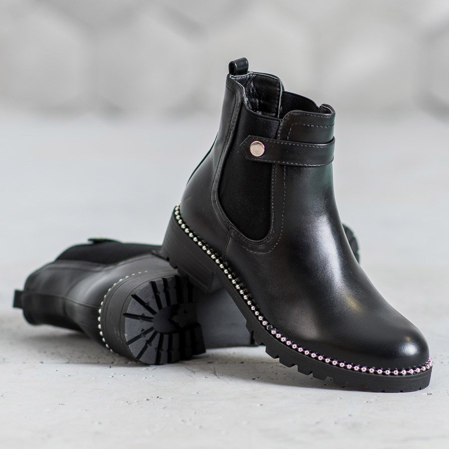 A stílusos széles, 3,5 cm magas sarok biztosítja a stabilitást, és egyúttal finom lányos varázst ad. A talp mentén strasszokkal és gyöngyökkel díszített csík egyedi karaktert kölcsönöz a Chelsea csizmának, felhívja magára a figyelmet, és kiegészít minden stílust.