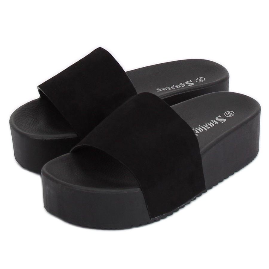 Fekete CK76P A magas talpú fekete papucsok minden nő ruhatárában kötelezőek! Ezeket a stílusos papucsokat divatos, magas, 5 cm magas talp jellemzi, amely minden lépéshez könnyedséget ad. A profilozott belső talpbetét hosszú ideig is kényelmes viseletet biztosít, a széles pánt pedig tökéletesen tartja a lábat, ami stabilitást és magabiztosságot jelent járás közben.