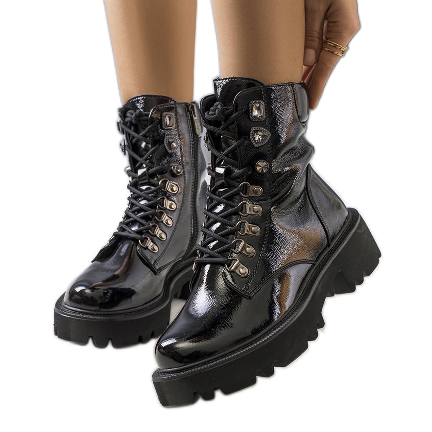 A klasszikus és ugyanakkor nagyon divatos - a PA1 -ből származó Igles csizma javaslatot jelent a szezonra, amikor a kényelemmel és az expresszív stílusgal törődik. A jellegzetes traktor talp, amelynek magassága a 4,5 cm -es platformon hozzáadja a sziklafigurát a cipőhöz, és a lakkozott kivitel és a finom cirkonok elegáns ragyogást adnak nekik.