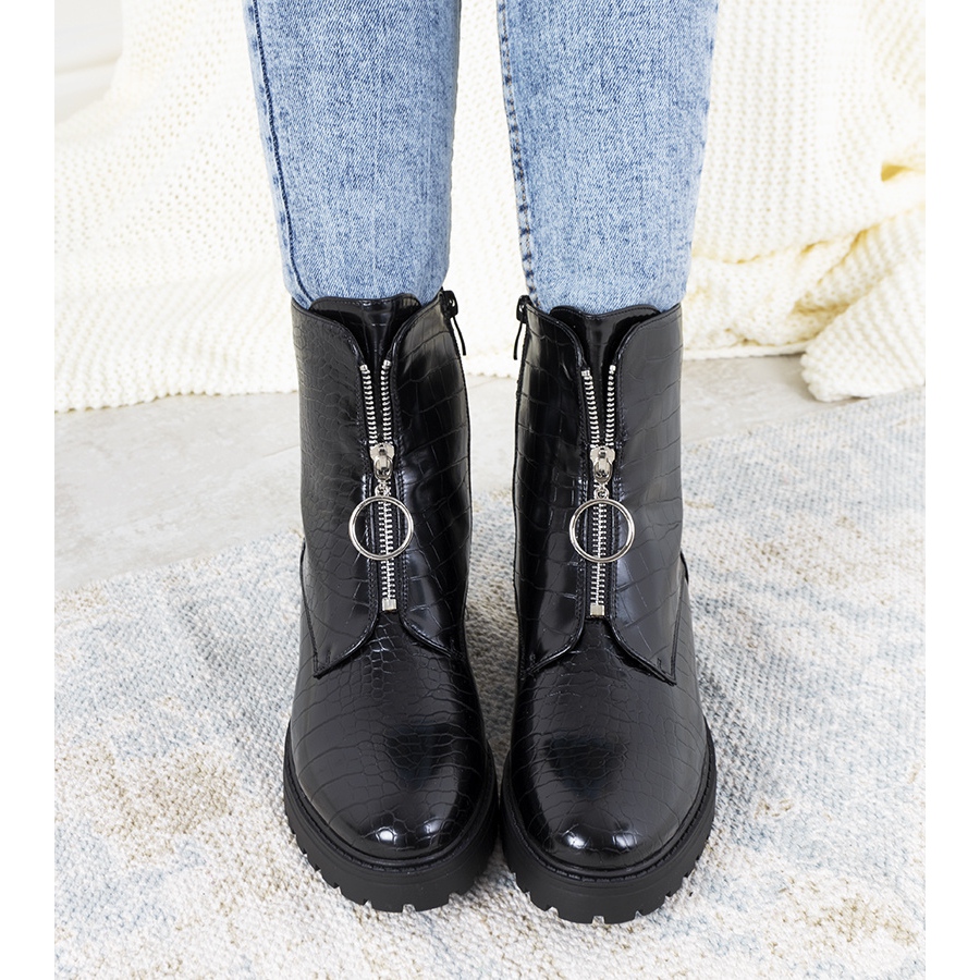 A csizmák divatos felsőrészét hamis cipzár díszíti, amely eredeti karaktert ad, és kivételesen stílusos megjelenést kölcsönöz. A magas, trapper talp elengedhetetlen kelléke a kortárs trendek között, amely biztosítja a kényelmet és a stabilitást viselés közben.