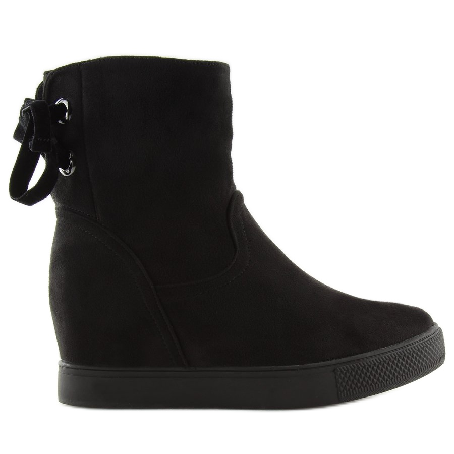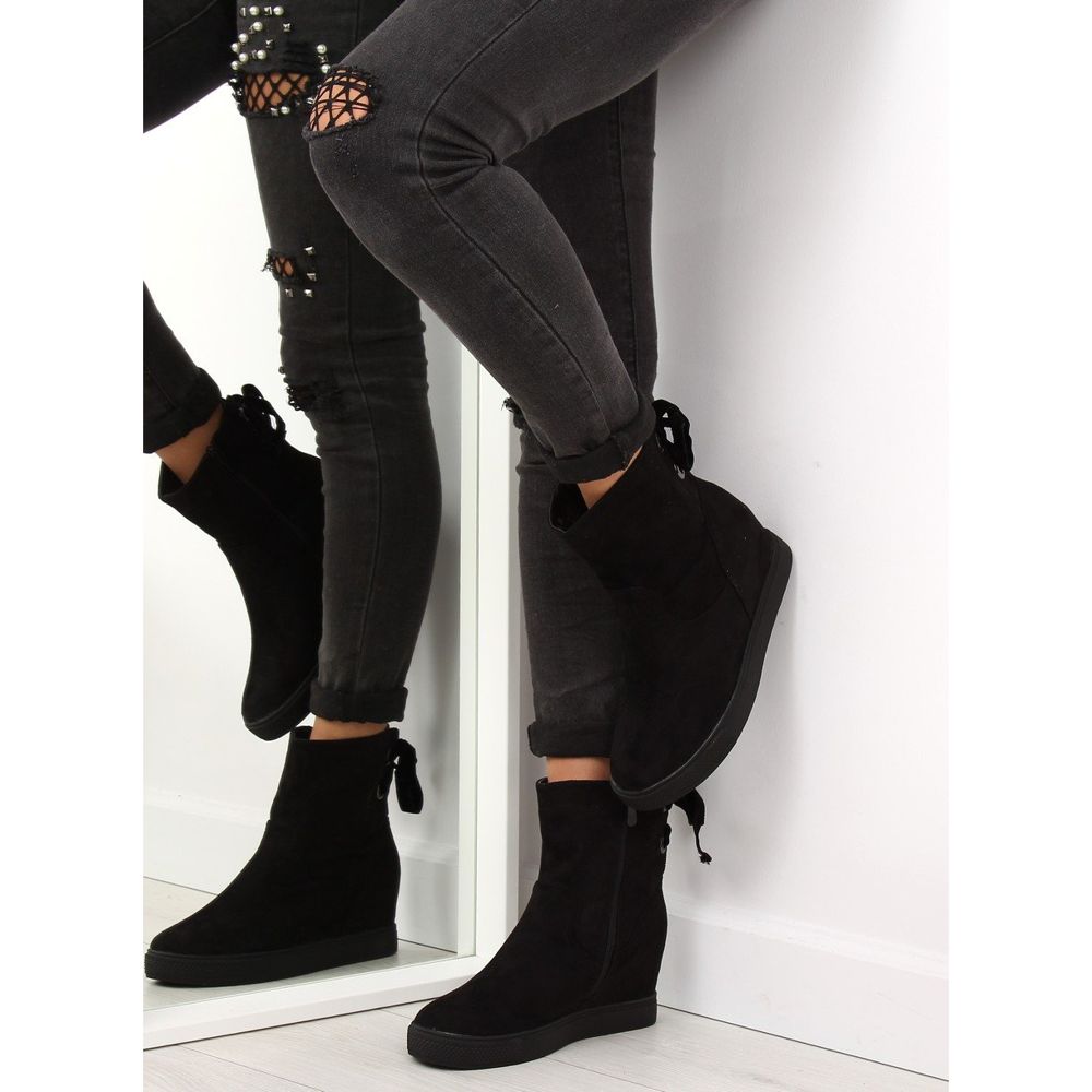 Fekete HQ886 Fekete rejtett ék alakú bokacsizma minden nő ruhatárának elengedhetetlen eleme, különösen az őszi szezonban. Ezeket az elegáns csizmákat a magas felsőrész és a dekoratív fűzés jellemzi, amely egyedi karaktert ad nekik. Ökológiai velúrból készültek, nem csak stílusos megjelenést biztosítanak, hanem a hab bélésnek köszönhetően viselési kényelmet is biztosítanak.