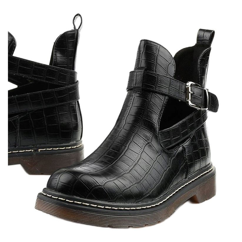 A fekete Nillda csatos bokacsizma tökéletes választás a modern nők számára, akik eleganciát keresnek egy kis avantgárddal kombinálva. Az ökológiai bőrből készült felsőrész kígyóbőrre emlékeztető szerkezettel nyűgöz le, amely egyedi karaktert ad nekik. A szabad bokák és a finom csatos rögzítés révén ez a modell ötvözi a stílust és a kényelmet, tökéletesen illeszkedve a szezon trendjeihez.