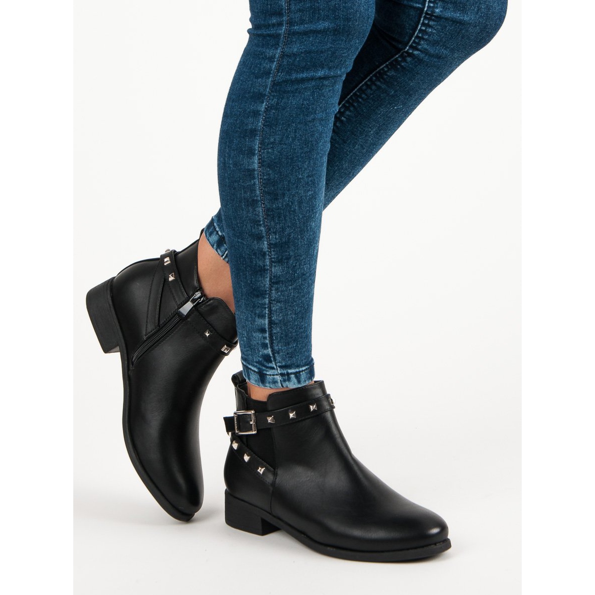 A fekete szín, a dekoratív csat és a strasszok egyedi karaktert adnak a csizmának, amely tökéletesen illeszkedik az aktuális trendekbe. Az oldalsó cipzár és a rugalmas szalagok kényelmessé és gyorssá teszik a cipő fel- és levételét.